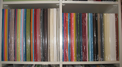 Now I have to say even though this seems like a lot of paper it isn't nearly enough for the card buffets, clubs and kids camp projects (or that is what I tell Pete). So, I have this shelf in my room that holds the "overstock" of paper. You know my faves, extra packs of Whisper White etc. Well, it's full. The overstock is full. Time to call 1-800-Addicted to paper (not Hoarders!)